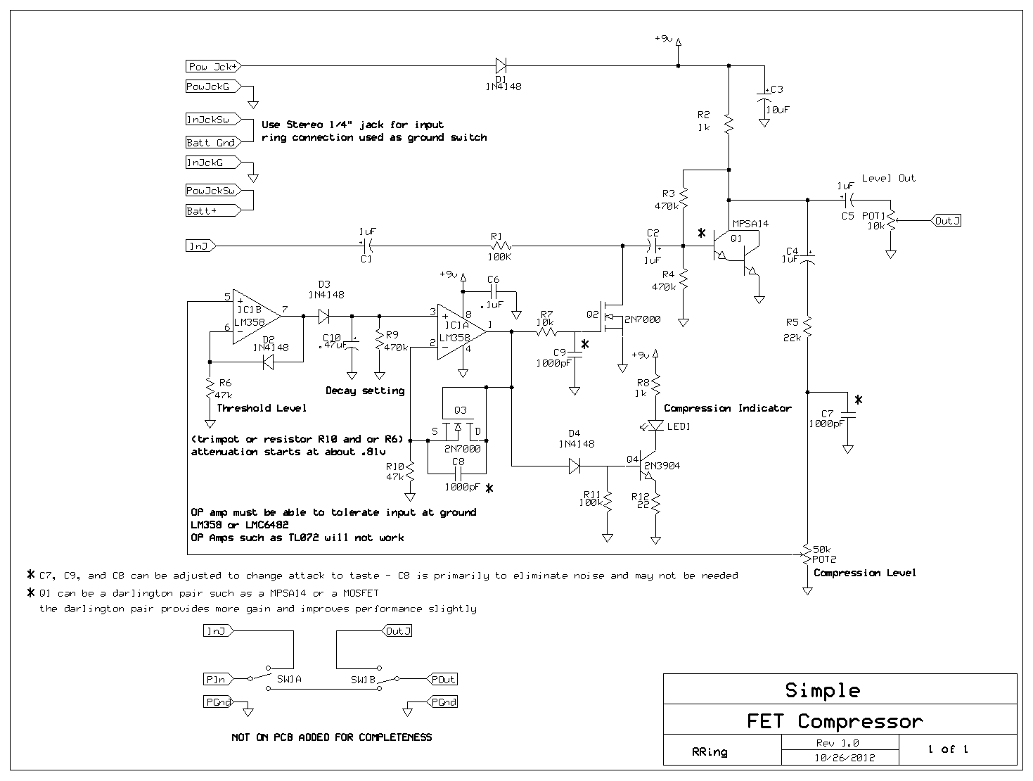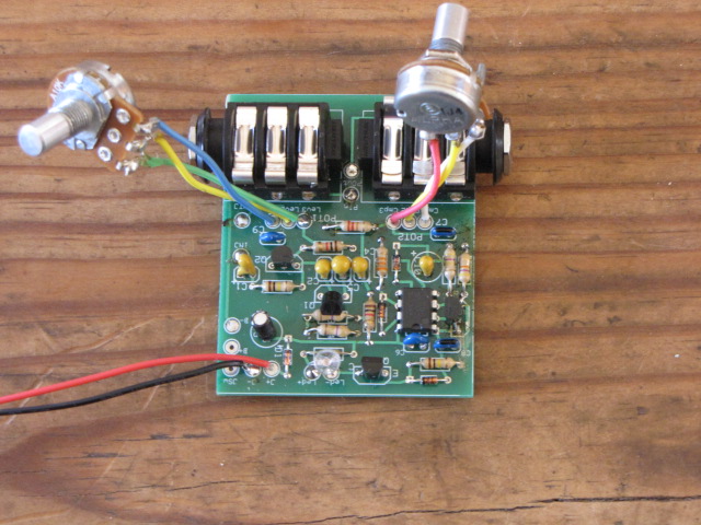 The second amplifier stage is the first stage of a LM358. It has a low frequency roll off at about 20 Khz to eliminate 60Hz hum and other low frequency noise. This is acomplished by the first order filter formed by C9 and R13. The second stage of the LM358 is a comparator with capacitor C12 added to beef up the pulses for better flashes and or clicks from a small speaker or piezo transducer.