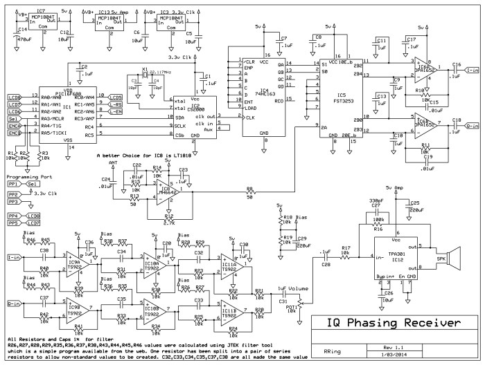 I am an amateur radio operator W4KIA and have always loved shortwave radio. I designed this radio to experiment with the basic platform of the Tayloe detector . It is intended mainly for AM shortwave listening – so there is a lack of sharp filters to optimize CW selectivity, etc. The radio is designed to used a random wire antenna for casual listening. I say this because one would want to change the circuit to optimize for amateur radio applications. This design should considered a reference or starting point and not a perfected turnkey project ready to build.