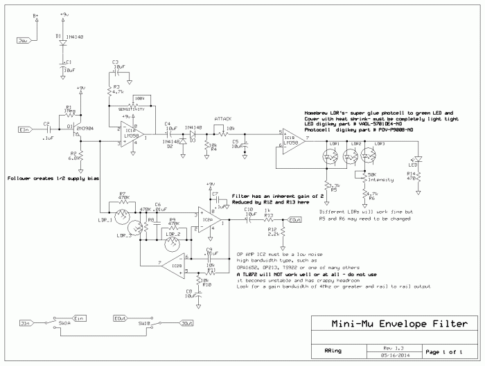 The LDRs are driven by a current mode amplifier and a simple diode peak detector. I used a LM358 for this but the the OP213, OPA1652 and the TS922 used in the filter section will also work. The design provides a sensitivity control, intensity(resonance) control and an attack control. The attack control really makes it easy to dial in the sweet spot of the filter and get very snappy or very slow plodding whah whah effects.