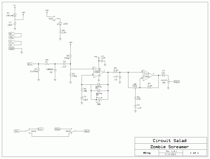 The Tube Screamer is a classic all around great sounding distortion, even though the stock circuit is not very complex, by eliminating the JFET bypass switching and utilizing true bypass you eliminate quite a few parts. Even more, you can eliminate the input and output follower stages a number of coupling caps and bias resistors. With just one op amp and less than 25 parts, you can make a tube screamer that sounds just great. In my implementation, I changed some values in the filter section to suit my taste and on the first stage I used BAT46 shottky diodes. These diodes have substantial reverse leakage- so you have to lower the impedance of the feedback pot and resistor that controls the the drive gain. That is why I used a 50k pot and 100 ohm resistor. I used the shottky because they start to clip much sooner and you can get a really insane amount of overdrive. Regular silicon diodes work just fine. The original stock values can be used and can be found on the web.
