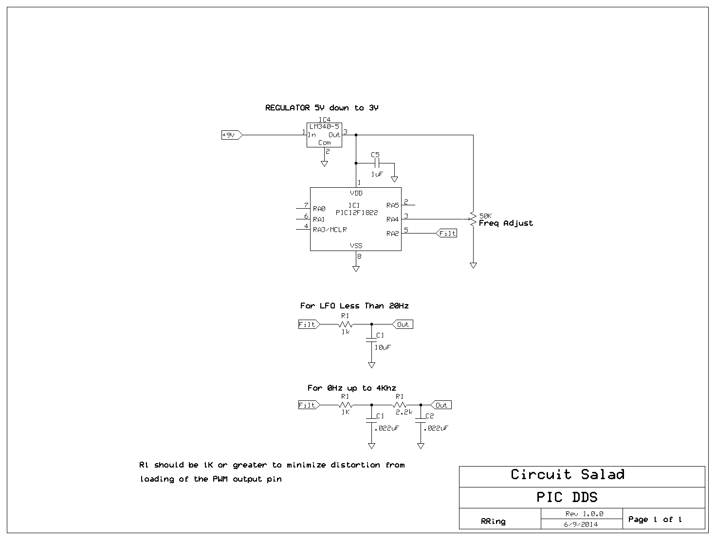 Originally, I used a 12f683 PIC running at 8Mhz but could only support 20KHz PWM at 8bit resolution. The circuit worked but made it harder to filter the output and limited the frequency range to about 1Khz. the part I used the 12f1822 has an internal clk that works up to 32 MHz. This allows a much faster PWM rate. Now I can get anywhere from .00005Hz to 5Khz output with a simple filter.