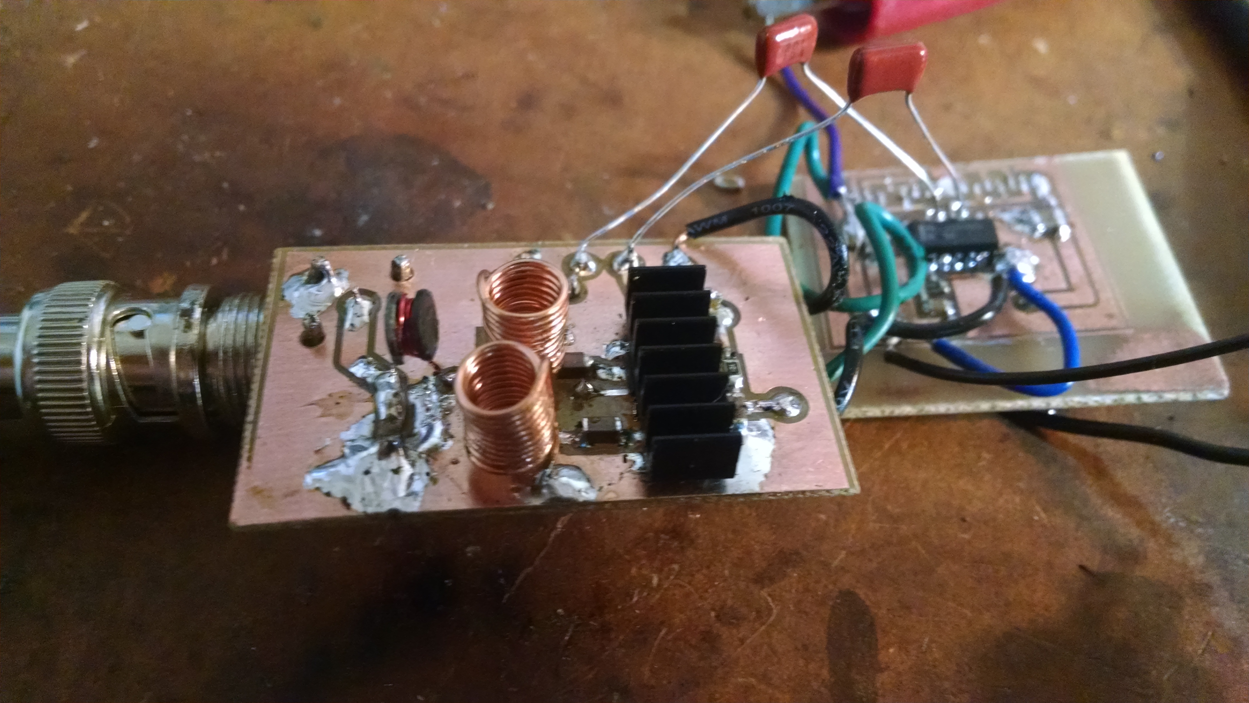The only drawbacks of this design are, one; you can only use 5v up 8V max to power the amp and two; it is not very efficient (mine runs at about 40%- 45%). It can draw .4 amps @ 8V – which is quite a bit of heat! Having said that, it is fun to build and tolerant of mismatched SWR. Overall, not bad performance. If you used two of them (8×8 push pull) you would need to adjust down the L network inductors and increase the capacitor(this lowers the impedance at the inverters further). I expect you could get more than 2 watts.