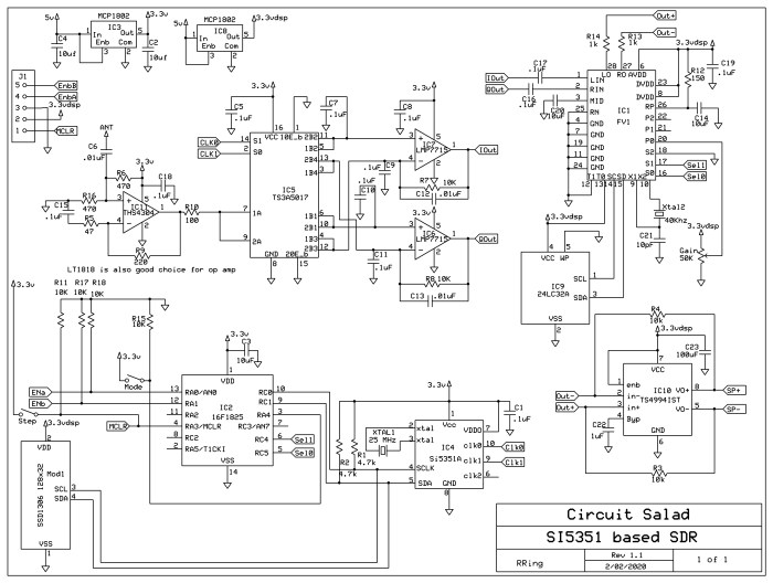 This is a revised version of my FV-1 based SDR. I replaced the CS2100 clk generator with the Si5351 clk generator. The Si5351 has some advantages over the CS2100, namely you can generate quadrature clks directly. This simplifies the hardware design and improves the quadrature accuracy. The sideband rejection in LSB/USB modes is impressive..somewhere around 60 db as best I can measure. The DSP processing is accomplished by the use of a FV-1 audio processor. The device makes the base band signal processing a snap. It requires some code to be loaded on a EEprom but the circuitry is simple and allows for up to 8 selectable programs. I created three: AM/USB/LSB . The FV-1 provides for three analog POT inputs to control any parameters you choose. Gain, variable filter bandwidth and depth, AGC are some examples of adjustable parameters if you desire. I kept it simple and created fixed band pass filters to taste. I did use one of the controls for AF gain. The design has no tuned circuits or band pass filters but they could easily be added. It works just fine without them. Occasionally, I come across a ghost signal from harmonic mixing, when tuning, but not enough to matter. The design uses an OLED display and a rotary encoder for tuning. The frequency coverage is from 2.7 Mhz to 25Mhz. The bottom limit is created by the inability of the Si5351 to support quadrature below this frequency. Although I have improved my DSP programs for the FV-1 and have developed new display drivers and the new code for the Si5351, useful detail about using the Fv-1 can be found in my original design from a few years ago: https://circuitsalad.com/2015/06/19/comming-soon-stand-alone-software-defined-radio-baseband-demodulator-no-computer-required/
