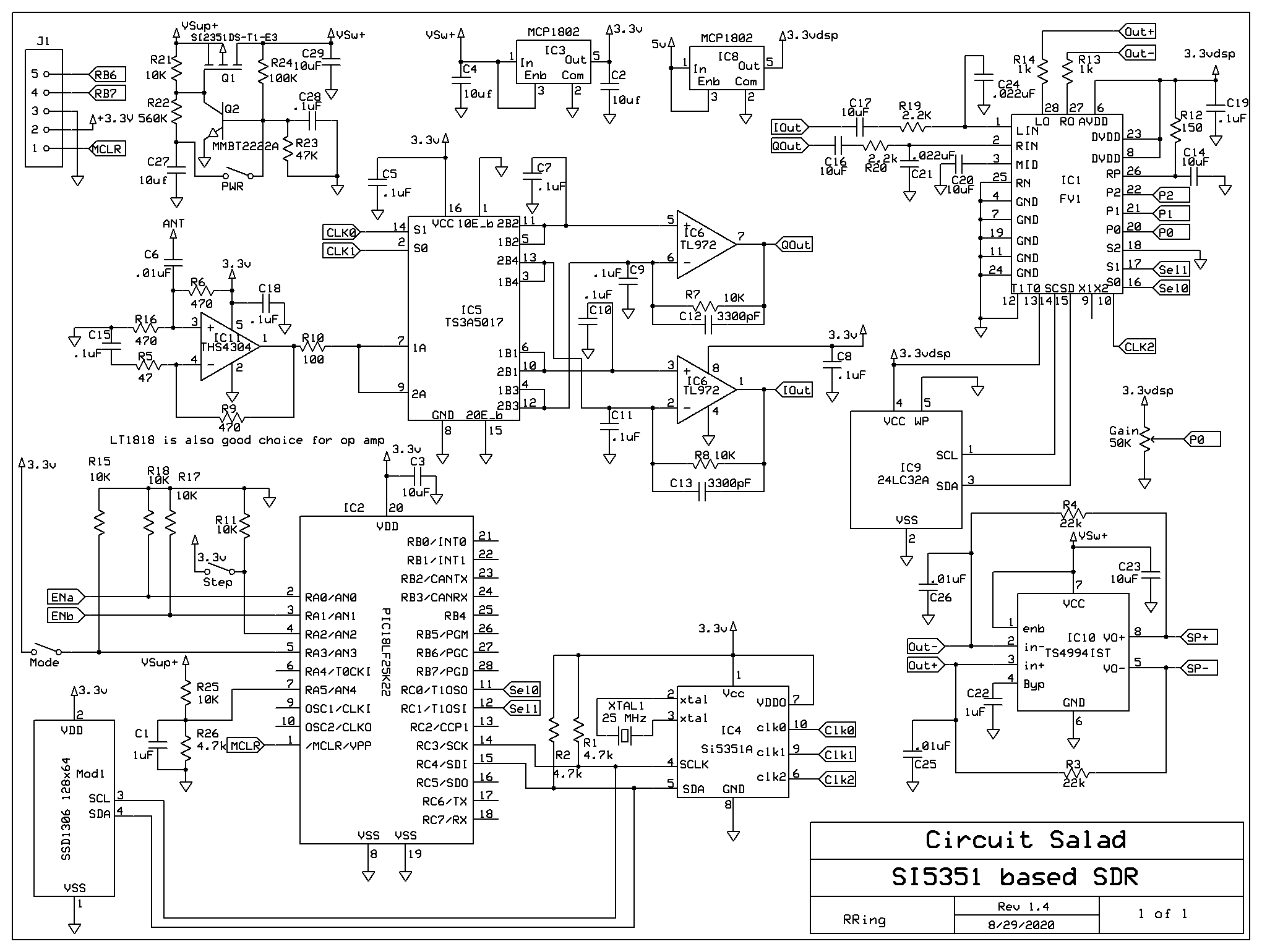 I have really enjoyed my FV-1 based mini SDR radio but it has one problem…its too small! I made the thing so small; it’s hard to operate and assemble. So I decided to make it a little larger, allowing for all the controls to be larger and more spaced out. It has a larger display and the circuit board layout provides for the switches, encoder, volume control and display all to be soldered directly to the board. All of the circuit components are now on the top side of the board as well. Along with these physical changes, I made some minor circuit changes. These include: some component value changes, a different microcontroller, clocking the FV-1 at 48Khz with the third output of the SI5351 and adding a on/off power circuit which utilizes a momentary switch instead of a latching one. It now has a built in flat pack lithium ion battery that can be USB charged. I also refined the DSP demodulators and I am now utilizing a weaver demodulator for USB/LSB.