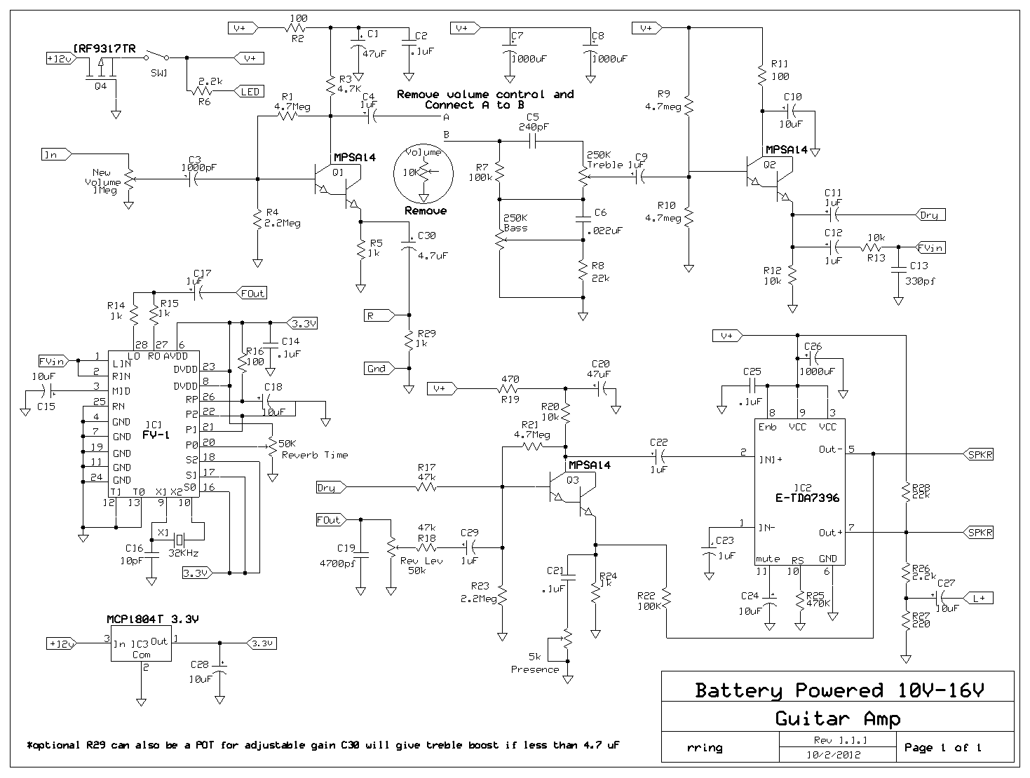 This is an idea I have had for a long time and I finally designed one. The results are excellent. The amp uses a surface mount car stereo power amp IC and can produce 25 to 30 watts with a 16V-18V supply into a 4 ohm speaker. The circuit fits in a 1590bb enclosure and has Reverb, Bass, Treble and Gain controls. The tonal response is tailored for guitar in the OP amp stages, along with the James/Baxandall tone stack. The James/Baxandall is a versatile choice because it provides boost and cut. I find it a better choice then the “beef stew” fender tone stacks. Reverb is provided by means of an FV1 DSP IC. It can be omitted easily if desired. The Power amp IC is bonded to the case to provide heat sinking when it is cranked up. I used a piece of 1/2 inch copper pipe -reshaped to be the heat sink. As I have done with some of my earlier amplifiers, I have employed negative feedback from the speaker back to a discrete stage driving the final amplifier. This is a common practice in tube amps to flatten the tonal response of the output transformers and so it is unconventional to apply it here. I find it affects the over all sound in a pleasing manner. The amount of feedback is small and could be increased or removed (this will affect the bias of the JFET Q3) All of the signal chains are low impedance (except the input) and gain distribution is such that the amplifier is very low noise. The amp powers up when the input is plugged in. The output is not ground referenced so the output jack is isolated from the case -(which is grounded via the heat sink). All you need is a tool battery or 12-18V power supply and a speaker cabinet and you can blast away. The mosfets used for polarity protection and power switching are just high current PMOS devices and not special – lots of other devices will work here. The op amp is a low noise type with a wide supply voltage range – others will work here also.