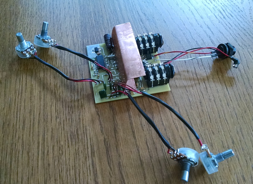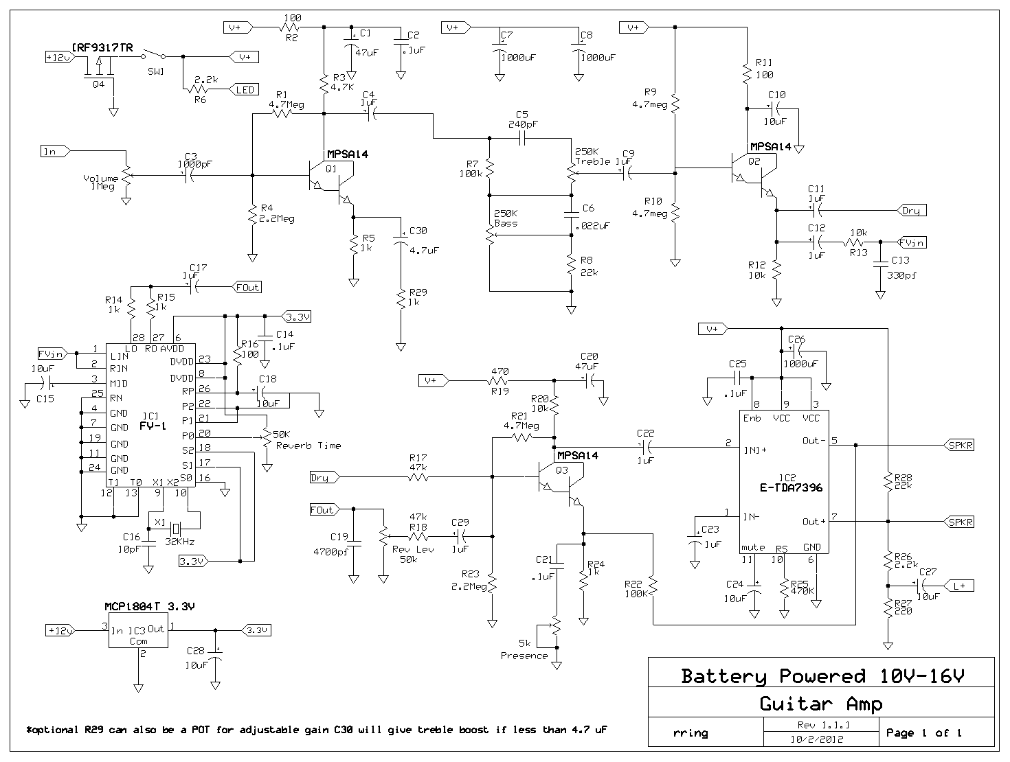 It has Gain, a single tone control, and reverb level control. The reverb room size is set by a resistive divider(R21 , R22) and can also be made adjustable. It utilizes a TPA3116D2 class D amplifier IC which can be configured for mono or stereo output.