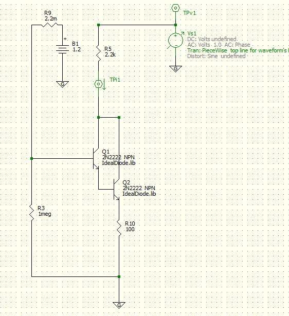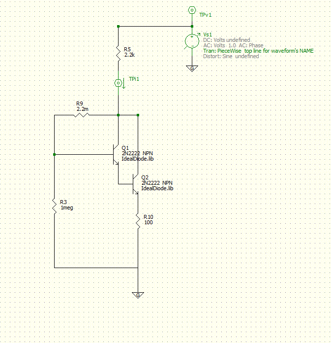 Now lets add the shunt/shunt feedback as shown below. You can see with the new circuit, that as the device is turning on, there is a small but highly non-linear region. This is because the supply voltage is below the point of actually biasing the device all the way on. As the supply voltage is increased, the device is biased on but the current through the device now is dependent on the supply voltage because as the supply voltage changes so does the base bias and therefore the current flow through the collector circuit. The alters the I/V behavior the device to act like a Triode where the output I/V behavior is much like a simple linear resistor.