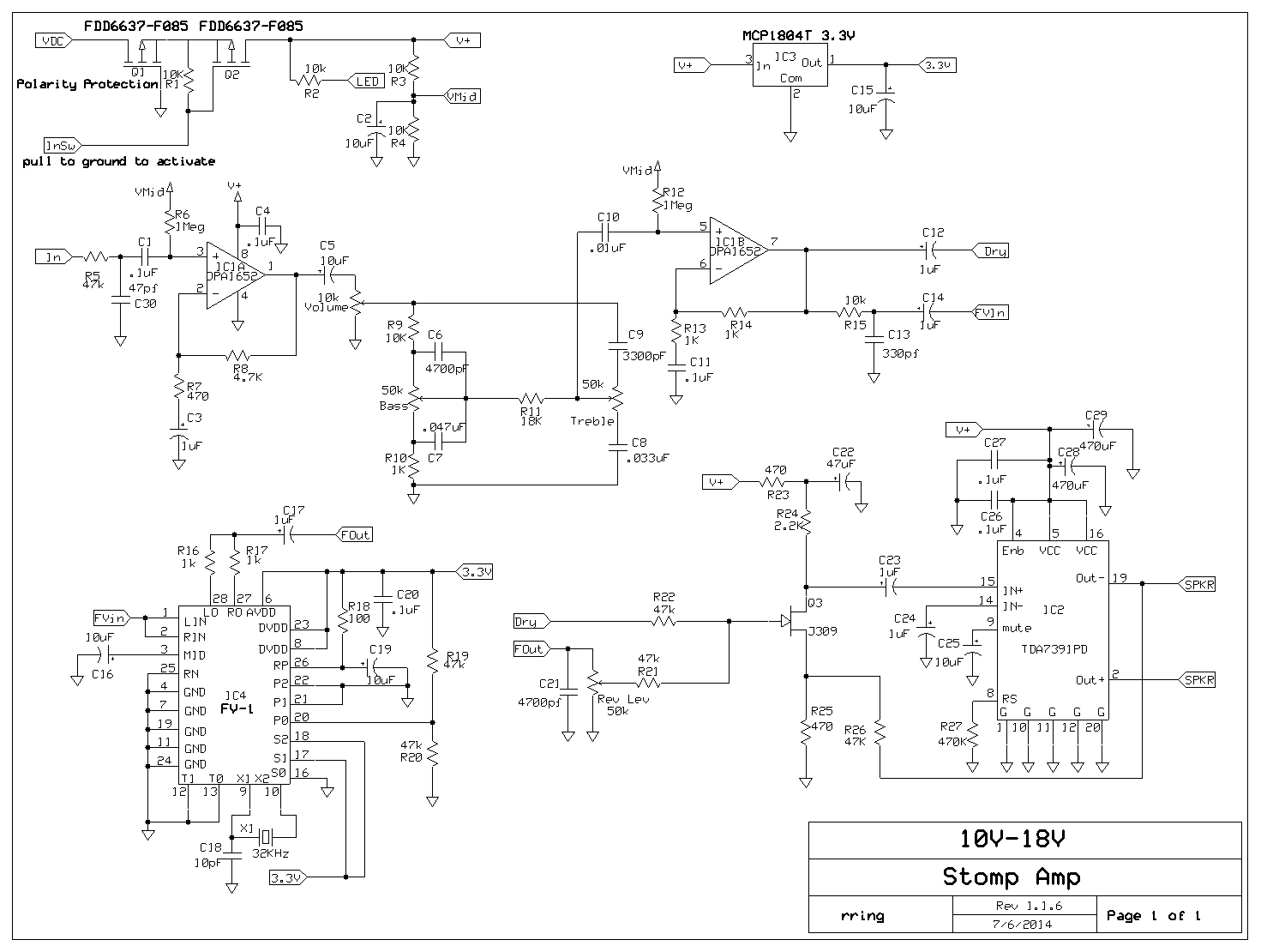 Continuing on my Stomp Amp theme; I have created a 100 watt (24V supply, 4 ohm load) guitar amplifier with FV-1 based DSP reverb and optional treble boost. It fits in a 1590b stomp box. Yes it really is a 100 watt amp!