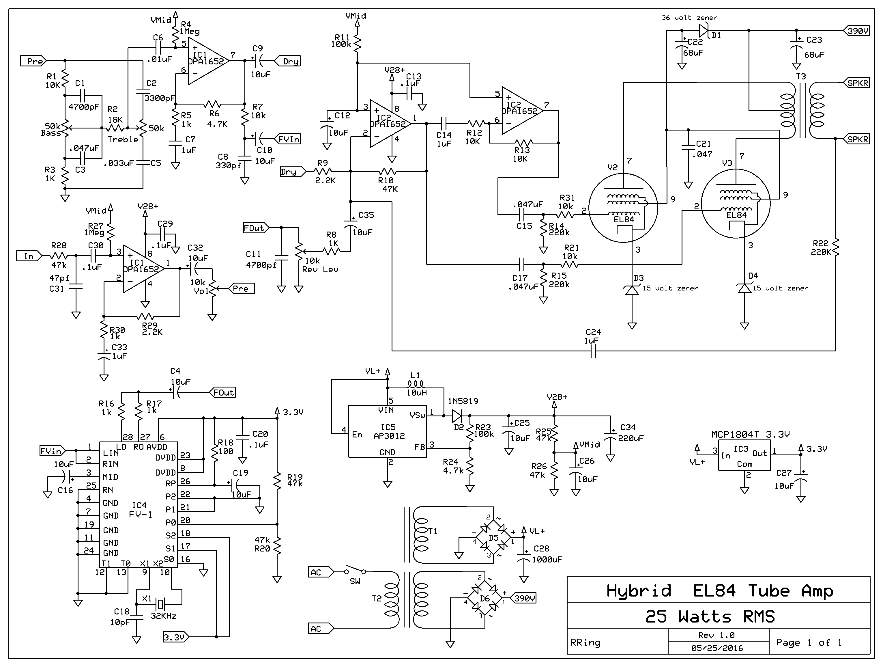 This is my new hybrid guitar tube amp which utilizes a solid-state input stage, DSP reverb, and solid-state phase splitter. Only the push pull, class AB output stage utilizes tubes, namely two EL84’s run at 390 volts with cathode bias. The bias uses two 15 volt zeners which creates a bias current of about 26mA. This requires almost 30 volts of swing on the grids to drive the amp to saturation. This is accomplished with a little switch mode boost converter that generates 29 volts to drive the phase splitter opamps. All of the solid-state circuitry runs off the AC filament supply for the tubes. The solid state portion is basically my stomp amp design( also on this blog) minus the final power amp, which is replaced with the phase splitter.