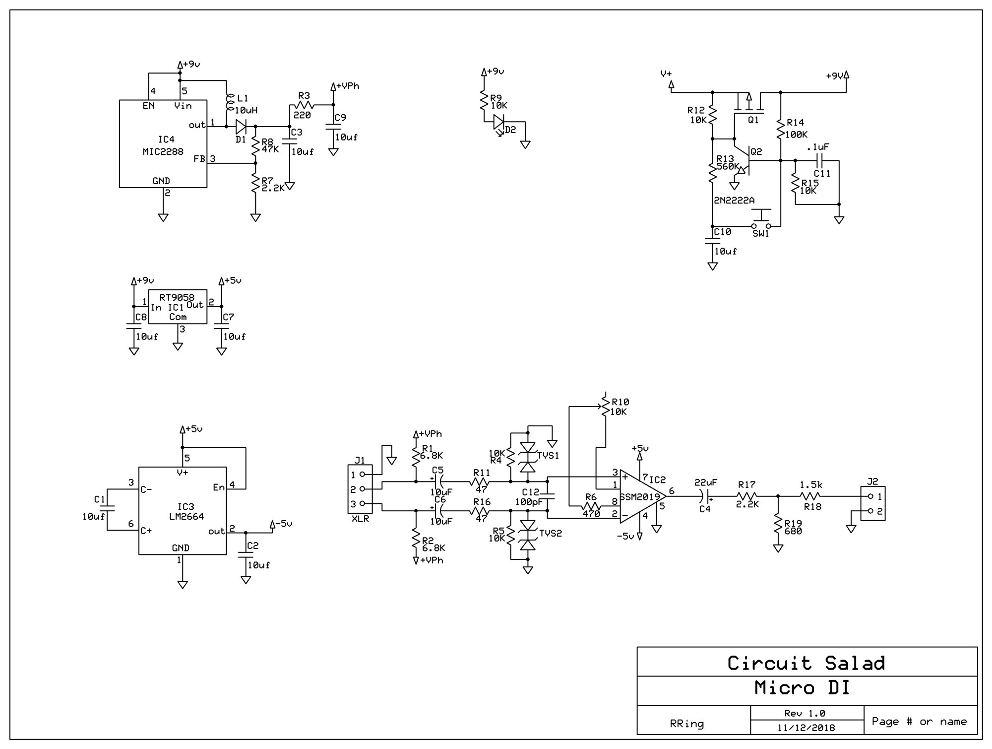I frequently use my phone to record video for my blog and for my music projects…but I have been frequently frustrated by the limitations of the internal microphone embedded in the phone. So I created this circuit to provide a means to use a high quality Dynamic or condenser studio microphone with my phone. The circuit operates from a rechargeable 9 volt battery and plugs into the standard 1/8 inch four ring audio connector. It provides phantom power at 28 volts…which works fine …you typically don’t need 48 volts It utilizes a SSM2019 balanced microphone preamp IC, operating from a dual polarity charge pump power circuit at +-5V. At the output you need to provide a 2.2k resistive signature such that the pone can detect the microphone connection. The circuit also employs my simple momentary latching switch circuit which I often use and is described here at circuitsalad. Everything about the circuit is straightforward but the phantom power over voltage protection circuitry merits discussion. Basically, the isolation capacitors C5 and C6 are slowly charged up by the phantom supply but depending on what is plugged and unplugged can be be discharged very rapidly into the preamp input circuitry. This will be destructive and requires circuitry to shunt this energy to ground and dissipate it. This is accomplished by means of TVS1 and TVS2…which are prepackaged back to back zener diode. However the issue arises that simply using large zeners or transorbs is not a good idea because they have large reverse bias junction capacitance…which creates distortion as it modulates. To prevent this, I chose a very tiny 9 volt transorb. The one I chose (DF2B6.8ACT.L3F) has only a few pF of capacitance and is very small(402) surface mount package. The device works great but can only sink 1 amp peak. This further requires series resistors R11 and R16 to help limit the surge current to less than 1 amp at 28 volt. R1, R2, R4, and R5 must all be precisely matched in order to maintain circuit balance. R4 and R5 are required to provide a absolute ground reference such that the output does not float to some common mode DC value above 0 volts. The gain of the preamp is -6dB -20dB and is adjustable by means of R10. The reason for the negative gain is the use of an attenuation network that also provides the 2.2K resistive signature for microphone detection. The attenuation is required because of the inherent gain of the phone circuitry, which is easily overloaded.